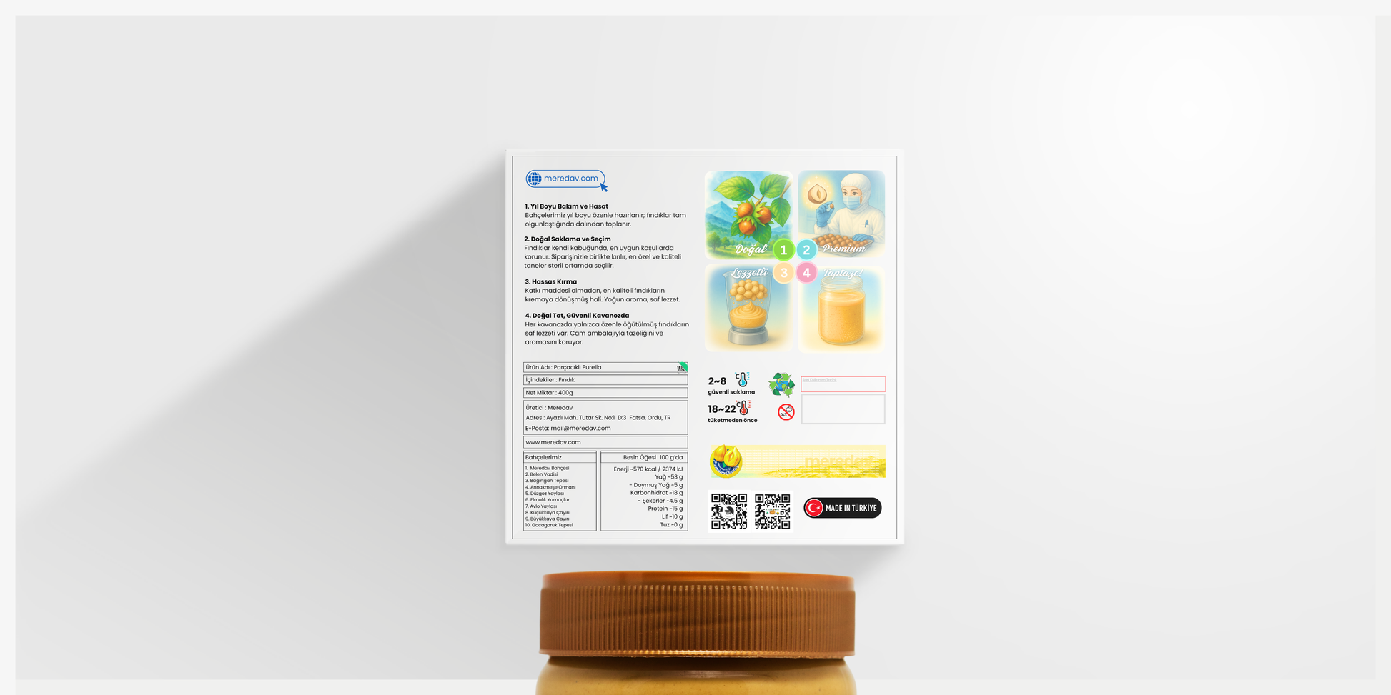 Karadeniz’in bereketli topraklarında, üç kuşaktır özenle yetiştirilen fındıklarımız, Meredav Purella için özel olarak seçilir. Geleneksel yöntemlerle kavrulan ve katkı maddesi kullanılmadan işlenen fındıklar, hassas öğütme tekniğiyle ezilir. İçinde yer alan iri fındık parçaları, her lokmada doğal kıtırlık ve yoğun aroma sunar.